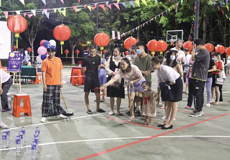 9月21日,塘厦三正半山温泉酒店在集团员工生活区举行了以“这个秋天一起登月狂欢”为主题的员工中秋游园会,现场既有“吃糖也欢乐”、“蛋黄莲蓉不要蛋黄”、“情投意合”等游戏节目,也有“七彩灯笼DIY”、“猜灯谜”、“中秋博饼”等传统项目,吸引了众多同事及家属参与,现场气氛喜庆而热闹。