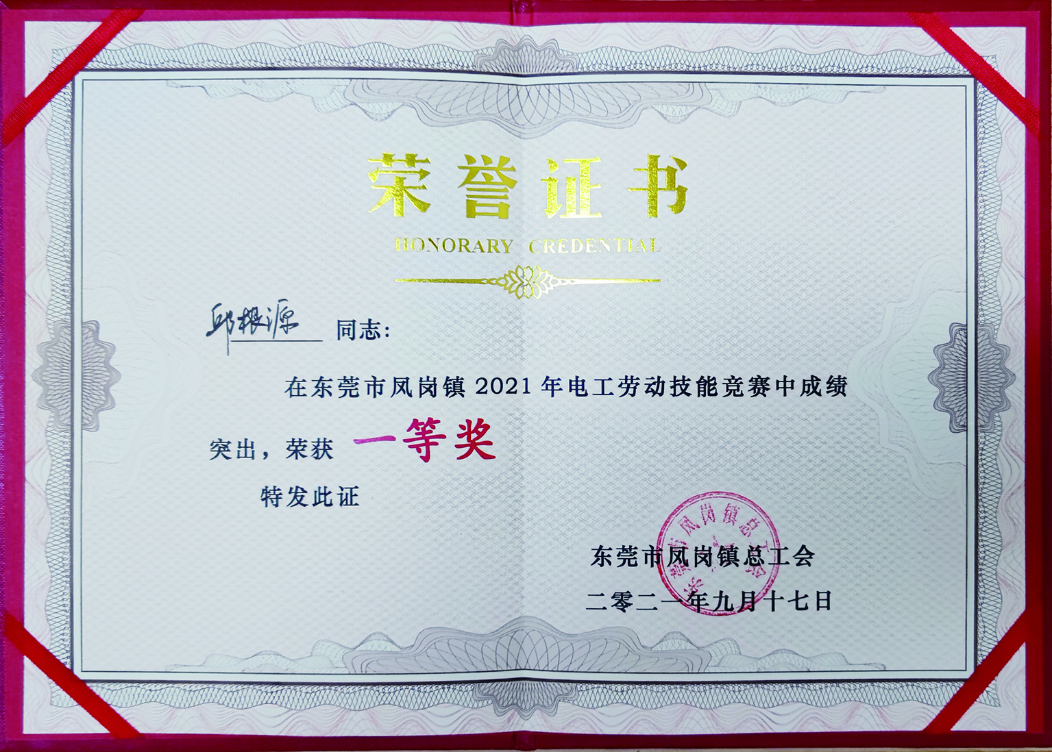 9月17日,由凤岗镇总工会和凤岗镇成人文化技术学校联合举办的2021年凤岗镇电工劳动技能竞赛在都市智谷产业园举行,来自凤岗镇各村(社区)、工业园区特种行业的80名电工代表同场竞技,展技能、亮风采。三正物业公司雁田区域工程主任邱根源和凤岗中心区域工程主任刘顶明踊跃报名参赛,凭借过硬的专业技术、扎实的理论功底及沉着应战的良好心态,在竞赛中脱颖而出,其中邱根源荣获一等奖、刘顶明荣获二等奖,邱根源还被市总工会授予“东莞市职工技术标兵”称号。