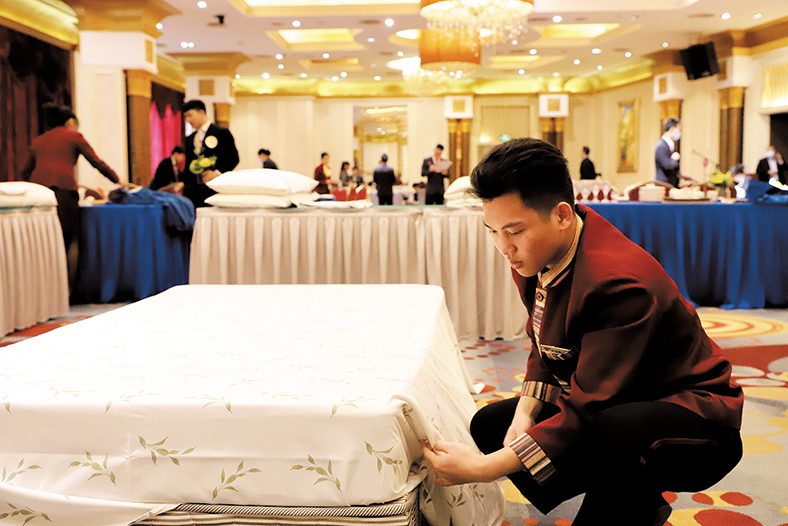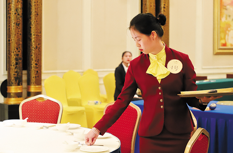 中式铺床、中式宴会摆台、前厅接待等项目选手在比赛中
