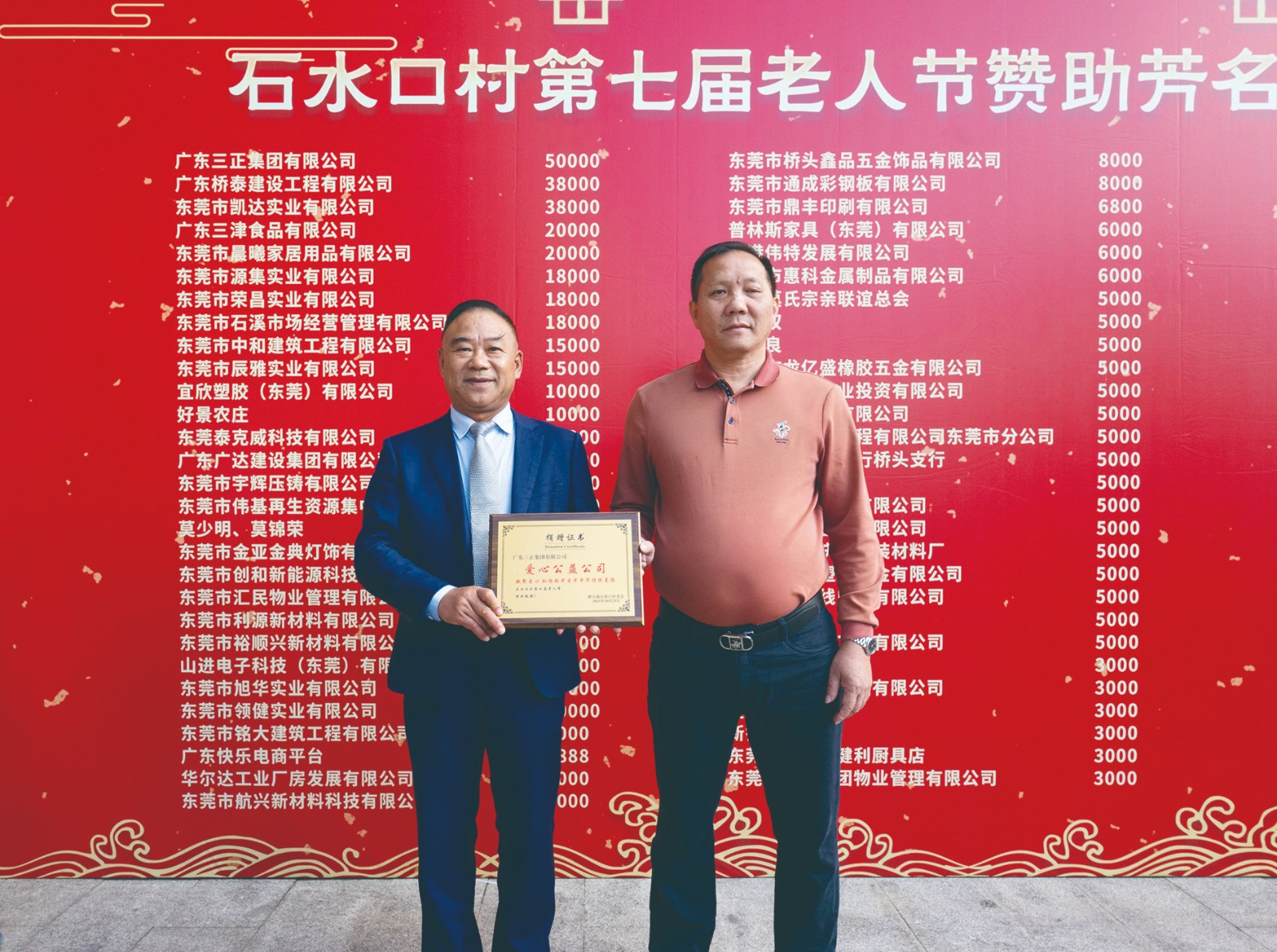 2.11月14日,桥头镇石水口村举行了第七届老人节,我集团捐赠5万元,与社会各界共同助力此次关爱活动。据了解,本次活动约1362名老人受到关怀。为表示感谢,石水口村委向我集团颁发了“爱心公益公司”捐赠证书。